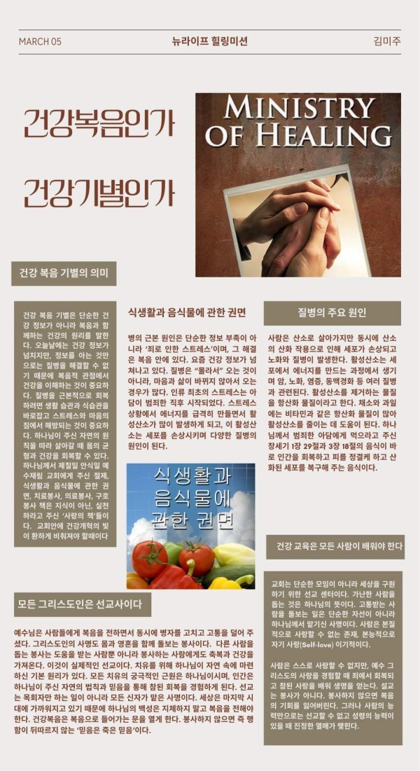 소그룹 건강복음인가, 건강기별인가 페이지 정보 작성자 주디김쪽지보내기 메일보내기 자기소개 아이디로 검색 전체게시물쪽지보내기 메일보내기 자기소개 아이디로 검색 전체게시물 작성일2026.03.05 07:00 조회수 751 글씨크기 + - 본문 오늘날에는 건강정보가 넘치지만, 정보를 아는 것만으로는 질병을 해결할 수 없기 때문에 복음적 관점에서 건강을 이해하는것이 중요합니다. 추천 0 페이스북 공유 트위터 공유 이전글SOSA 영성수련회에 여러분을 초청합니다. 26.03.26 다음글소그룹 교육 생활속 아로라 테라피(힐링아카데미) 26.03.01 댓글 0 댓글목록 등록된 댓글이 없습니다. 목록
