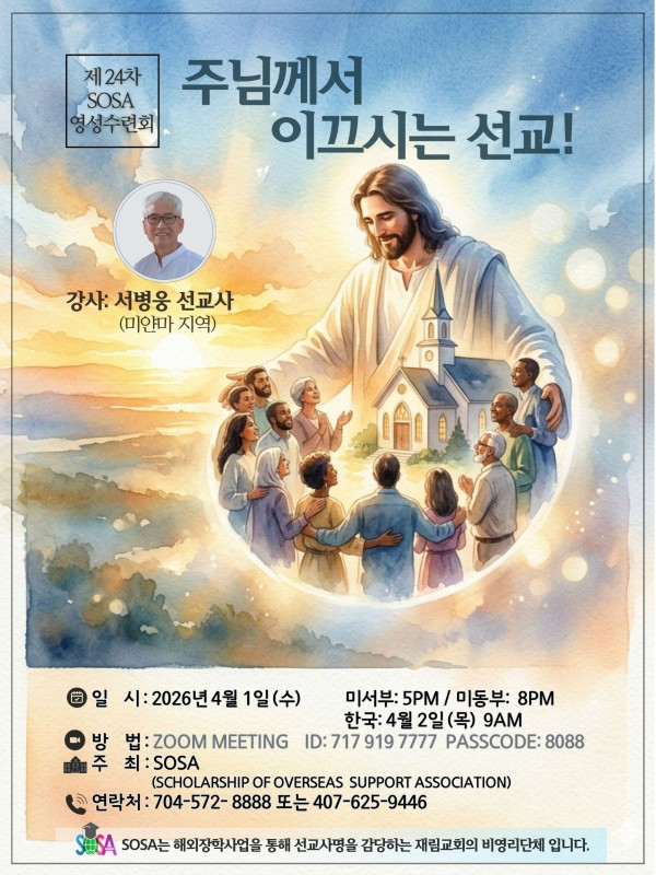 해외선교 SOSA 영성수련회에 여러분을 초청합니다. 페이지 정보 작성자 문진산쪽지보내기 메일보내기 자기소개 아이디로 검색 전체게시물쪽지보내기 메일보내기 자기소개 아이디로 검색 전체게시물 작성일2026.03.26 15:36 조회수 331 글씨크기 + - 본문 SOSA 영성수련회에 여러분을 초청합니다. 추천 0 페이스북 공유 트위터 공유 이전글영어로 복음을 ! 제 3기 영어 선교 설교 훈련 과정 모집 ( 2026. 4월 ~6월 ) 26.03.26 다음글건강복음인가, 건강기별인가 26.03.05 댓글 0 댓글목록 등록된 댓글이 없습니다. 목록