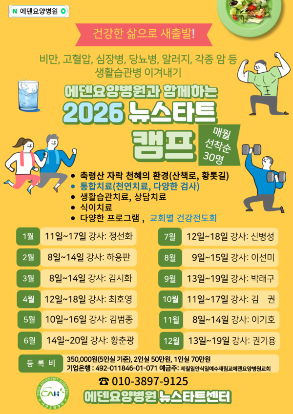 기타 26년도 에덴요양병원 뉴스타트 힐링캠프 1년 스케줄 및 강사소개 [1주 등록비: 35만원]