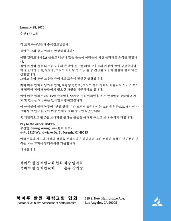 이에 미주 협회는 2월 15일 안식일을 남가주 산불 이재민을 돕는 안식일로 정하였고 기도 및 헌금을 모금하는 안식일로 정하였습니다.