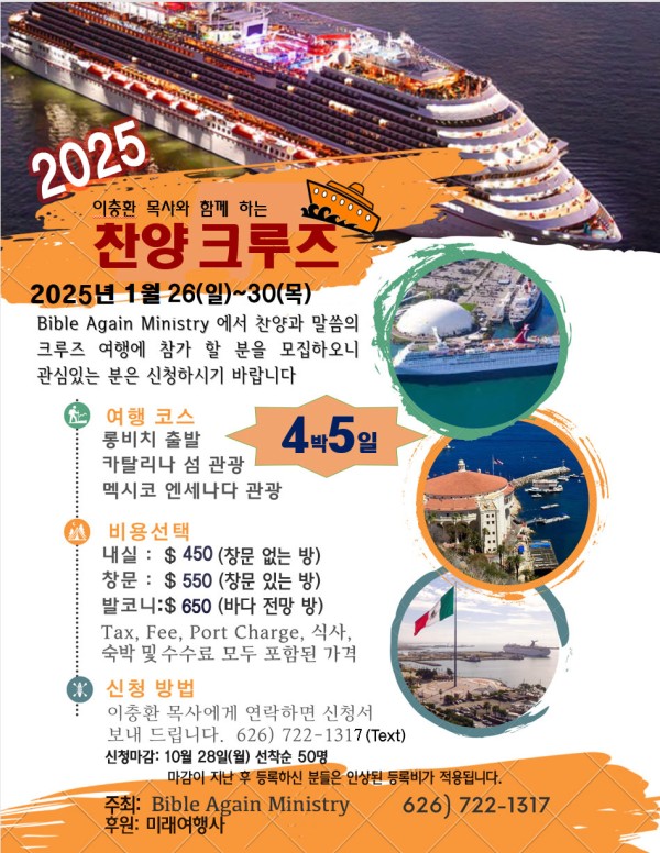 2025 찬양 크루즈를 개최합니다. 여행을 통해 아름다운 자연을 함께 경험하고 이충환 목사와 함께 찬양과 말씀, 기도하는 시간을 갖게 될 것입니다.