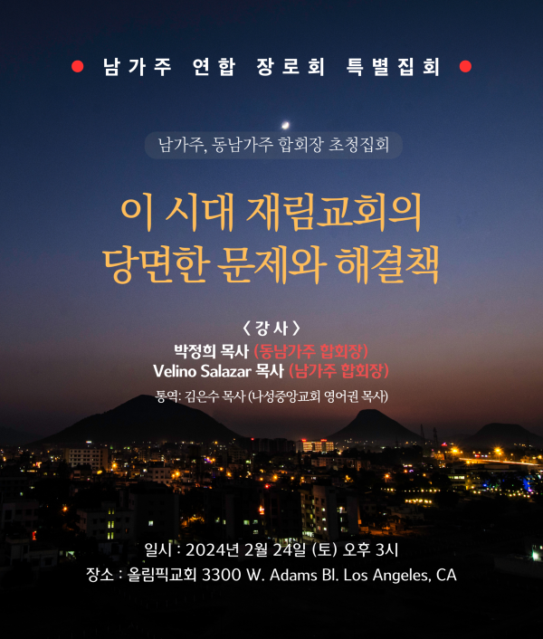 기타 동남가주, 남가주 합회장 초청특별 집회 <남가주 연합 장로회 > 페이지 정보 작성자 최고관리자쪽지보내기 메일보내기 자기소개 아이디로 검색 전체게시물쪽지보내기 메일보내기 자기소개 아이디로 검색 전체게시물 작성일2024.02.12 22:07 조회수 12,432 글씨크기 + - 본문 <이 시대 재림교회의 당면한 문제와 해결책> 추천 0 페이스북 공유 트위터 공유 이전글2024 인터네셔널 카얌 네팔 단기 선교사 모집 24.03.01 다음글Napa(캘리포니아)에서 진행될 백투에덴 디톡스 힐링 캠프에 초청드립니다! 24.02.08 댓글 0 댓글목록 등록된 댓글이 없습니다. 목록