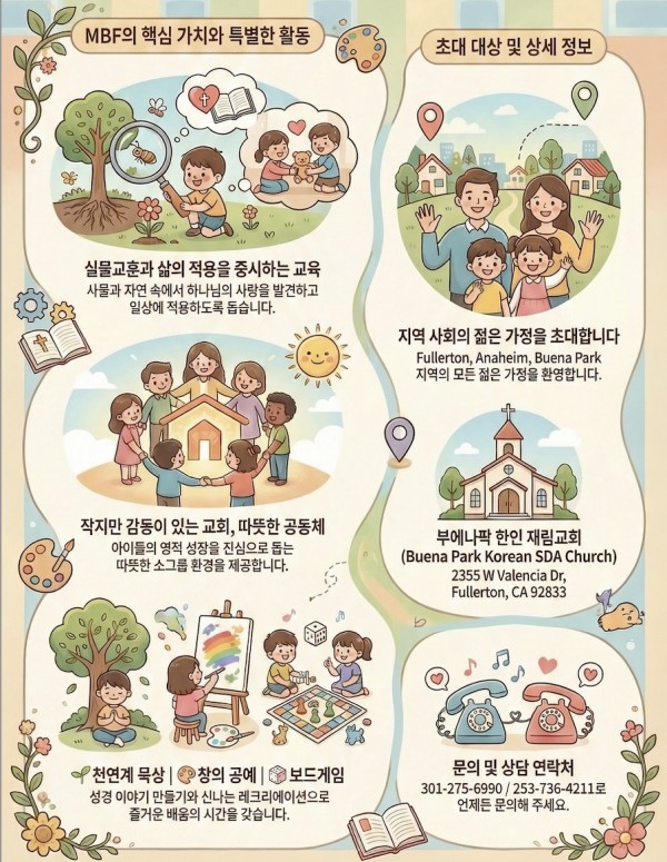 자녀들의 신앙과 언어, 그리고 건강한 공동체 속에서의 성장을 함께 고민하시는 신앙의 부모님들께 부에나팍 교회로 정중히 초대드립니다.